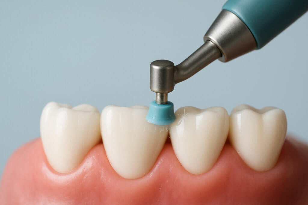 PMTCは、回転式の「プロフィーコントラアングル」と「ラバーカップ」と呼ばれる専用の電動ゴム製ブラシを用いて行います。